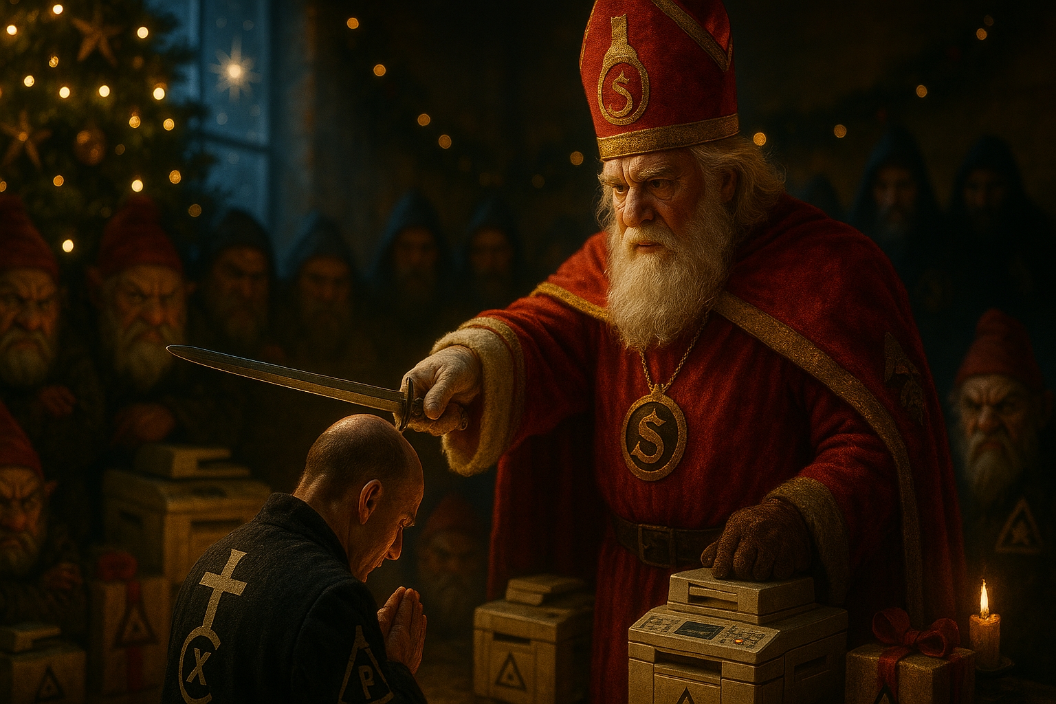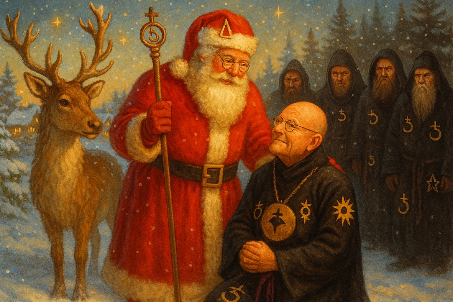 Prominent in dieser Erzählung ist die Szene des 23.12.1963, in der Eugen Grosche den knieenden Maikowski mit Handauflegung zum "Nachfolger als Grossmeister der Fraternitas Saturni" weiht. Oder geweiht haben soll. Maikowski erzählt diese Szene mit Detailverliebtheit und weihnachtlicher Ekstase. Das wirkt literarisch durchkomponiert und erinnerungspolitisch inszeniert. Man erkennt eher Legende und Mystifizierung als ein nüchternes Protokoll. Genau so wird sakrale Autorität nachträglich überhöht und gegen spätere Konkurrenzbehauptungen abgeschirmt.
