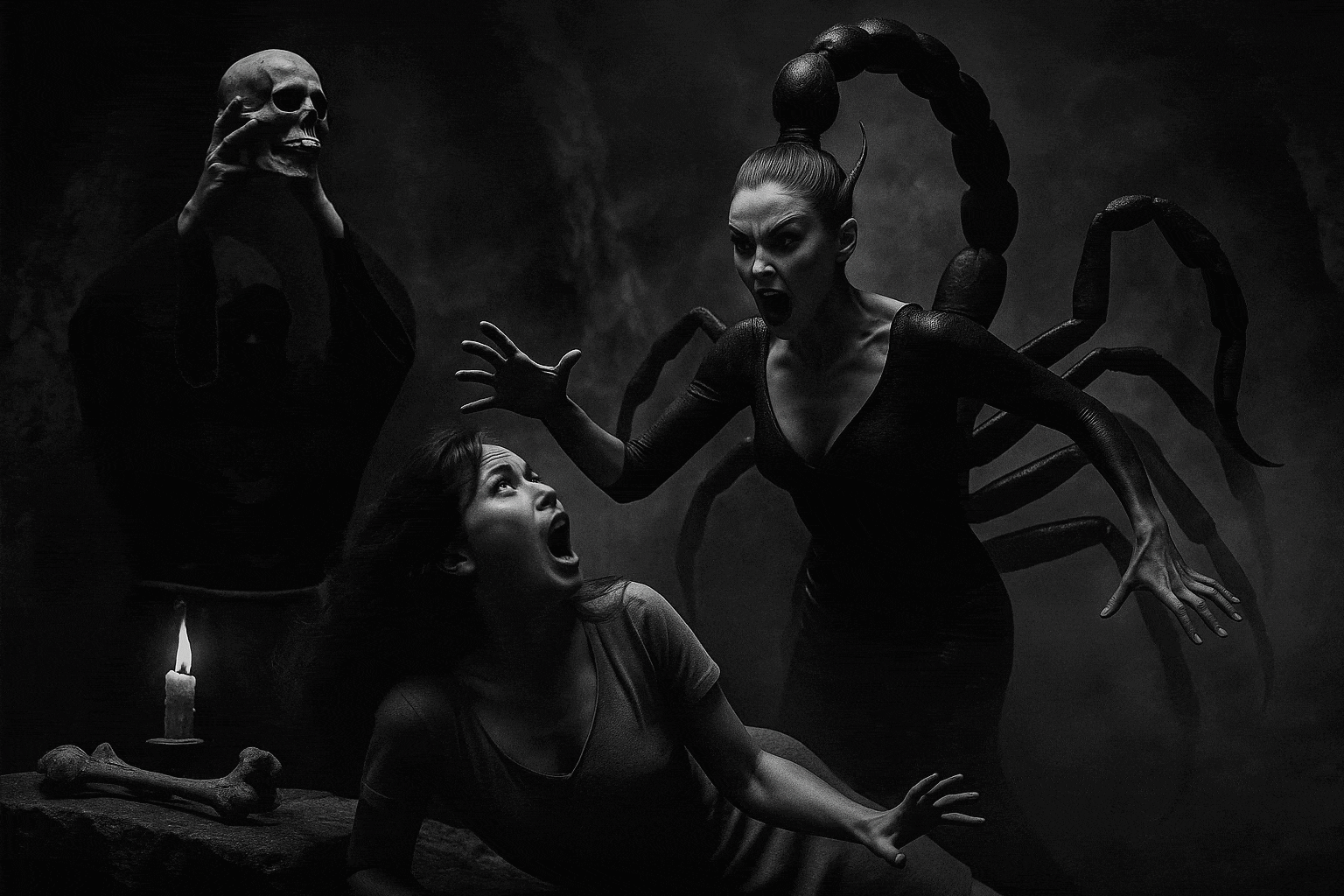 Neben Hammer dringt in Westdeutschland zur gleichen Zeit italienischer Giallo-Gothic-Horror ein, etwa La maschera del demonio / Black Sunday (Regie Mario Bava, 1960), La frusta e il corpo / The Whip and the Body (Regie Mario Bava, 1963) oder Lo spettro / The Ghost (Regie Riccardo Freda, 1963). Diese Filme, oft mit Hexen, verfluchten Frauen, wiedererweckten Toten, liefern einen anderen, aber verwandten Baustein: die Frau als dämonische Rachekraft. Sie ist nicht bloß passive Gefesselte, sie ist die Rückkehrende, die Inkarnation des Fluchs. Sie ist erotisch markiert und zugleich tödlich. Auch das spiegelt sich bei Wolther: Seine Skorpionfrau ist die Verkörperung einer außerirdischen, strafenden Intelligenz. Das rechtfertigt seine Pose als Mann an der Schwelle: Er allein hält diese Macht in Schach, er allein wagt den Handel.
