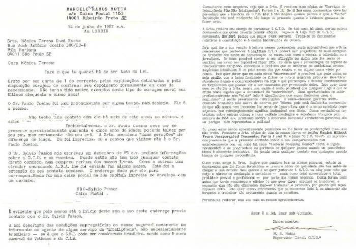 Dear Mônica Teresa: Do what thou wilt shall be the whole of the Law. Thank you for your letter of the 1st of June, and for the detailed explanations, and for your courageous disposition to confirm your statement formally if necessary. I haven’t seen such examples of moral courage in my fifty-five years of life! Mr. Paulo Coelho was our Probationer for some time, but he gave up. He is the person whom I mention in A.A.D. (Astral Attack and Defense) [...] I haven’t had any contact with him for the past seven years at least, [...] Incidentally, Mr. Paulo Coelho must be about 45 years of age; he could be your father, but certainly not your grandfather. When you referred to him you mentioned “two generations” of difference between yourself and him. You were either imprecise in your statement or the person you met was not Mr. Paulo Coelho. Mr. Sylvio Passos wrote us in December 85 e.v. asking for information about the O.T.O. and he received it. Since then, he hasn’t had any direct contact with us, neither has he bought any of our books. A circular note announcing the publishing of A.A.D. was sent to him a couple of months ago. This has been the extent of our contact with him. The address given to us by him was an address in your city, stamped in the envelope, as follows: Caixa Postal xxxxx xxxxxx xxxxxxxxxxx SP It is evident that this address was still a contact for him until early this year. Your descriptions of his working conditions suggest once again an agent of informer of some “intelligence” service, not necessarily Brasilian (if the S.N.I. can be at all considered Brasilian, being a branch of the Vatican and the C.I.A.). While consulting my files, I gather that you have already received your copies of “Intelligent Services are Not Intelligent” Parts I and II. If you have already read these documents, you must have perceived that the history of the O.T.O. is not as simple as it appears to be and that the “Saintly” Inquisition is not so far from the present as the Vatican would like us to believe. You once again reaffirm you wish to join the O.T.O. In this case, there are certain documents that you still need to read. Please order them from the Nuit Lodge of the O.T.O.; again, you will be asked to pay for the xerox copies. These are documents related to the Constitution and hierarchic lineage of the Order. Whatever your reaction is while reading these documents, it would be wise for you to ponder that joining the legitimate O.T.O. will interfere with your professional ambitions in the field of mass media, such as the movies, television or journalism. If it would be possible to maintain your affiliation in silence, it would be helpful; but I believe it is impossible to do so. I tell you that the percentage of spies of reactionary religions, economic and political tendencies that infiltrate in authentic masonic, initiatic orders is at least ten percent. That means that for each five “interested” candidates, it is possible that at least one is a spy, with the ultimate goal of keeping files on other members, trying to encourage illegal and compromising activities within the lodge they belong to, and immediately denouncing those “illegalities” under these circumstances. This means that if you are not a spy yourself, it is very possible that within any Lodge that you might possibly become affiliated with, someone will report you to the “authorities”. Your opportunities of professional growth in the “media” (isn’t it significant that these puppets Americanize the word?) will be severely restricted. The so-called government, so-called Brasilian does not love Thelema, since it is finally convinced that we are neither innocent (that is ignorant, according to the christist definition of the word, not harmless according to its etymological definition) nor useful. We are true patriots, among other things. And in an ideological and economic colony (forced by the rape of 1964 e.v. practiced against the national sovereignty) true patriots are a danger: they represent the police! I might be coming across to you as extremely pessimistic while making you ponder about the above, but I don’t think so. If you have had copies of our books in English, Magick without Tears Unexpurgated Commented Parts I and II, and would have read the “O.T.O. News” within it, you would have understood the present confusion about my appearance in a place called “Esoteric Shopping Center” (notice again the English!), owned or managed by anyone using a Hindu pseudonym is highly indicative. I would never have any contact with any pseudo Hindus of any kind. Thus, he who warns is a friend. I suggest that you ponder well my words, study the documents that were sent to you, before you join the O.T.O., because as you will know, I demand total honesty, and personal and professional probity from all members. In this manner, sooner or later, I recognize and eliminate (meaning, I expel) the traitors; and while they are not eliminated, I make them work and produce, as little as they are capable of. This means however, that the innocent (rather, the sincere) are forced to work as hard as the deceitful. Please let me once again thank you enormously for your support. Love is the law, love under will. Sincerely, [signature] Marcelo Ramos Motta General Supervisor O.T.O. Translation © Monica D. Rocha Traduções portuguesasPeter-R. Koenig: Introdução à Ordo Templi Orientis.P.R. Koenig: Os Espermo-Gnósticos e a Ordo Templi Orientis. P.R. Koenig: Criação Extática de Cultura. P.R. Koenig: A Aura do Fenômeno O.T.O. P.R. Koenig: O Ambiente do Reich dos Templários — Os Escravos Servirão. P.R. Koenig: Fetiche, Auto-Indução, Estigma e Rôleplay. P.R. Koenig: Versão Jogo de uma O.T.O.–Fatamorgana. P.R. Koenig: Carl Kellner Jamais um membro de qualquer O.T.O. P.R. Koenig: Theodor Reuss: Avô da Sociedade Antroposófica? Theodor Reuss: Programa De Construção E Princípios Orientados Dos Neoc