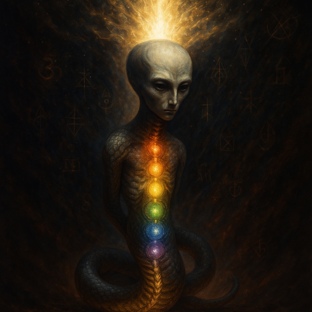 THE LAM-SERPENT SADHANAMichael Staley![]() [AI-generated Image] I. Background to this SadhanaThis is the second in a series of articles arising out of the development of Lam as a Way of Initiation. Readers may recall the conclusion of the article 'Lam: The Gateway' in the previous issue of Starfire, that Lam was not simply an entity, but a Gateway to the direct experience of Gnosis. This Direct Experience is the goal of magical and mystical working. The proof of the pudding is in the eating. If Lam has such a potential, then that potential should be readily tapped. Therefore, fresh ways of working with Lam should be coming to the fore. It is in this spirit that the present sadhana has been developed, and is offered to anyone who wishes to try it. Do not expect a gleaming, finished product, but rather a skeleton approach which must be fleshed out by the Initiate for himself or herself. As a matter of interest, the need for customisation and elaboration is the case with all rituals and practices. Even a practice as apparently simple as the Lesser Banishing Ritual of the Pentagram is worked differently by each Initiate, no matter how closely he or she may try to keep to the text. This is because, apart from differences in gesture and pronunciation, the fulcrum lies in the imaginative evocations, and these will differ considerably from person to person. More than this: the practice is different from one working to the next. If these considerations are true for the simpler rituals, how much more so in the case of more complex ones, such as Reguli or Samekh. There is another reason for the approach of laying skeletons before the revered presence of our readers - for we at Starfire are not gratuitously necrophilist. Readers - or rather, those that are sufficiently interested to not only read but to work with what they have read - will gain maximum benefit from a practice not by merely following something laid down, but by experimenting and on the basis of their experience adapting the ritual to suit themselves. This approach is sound. Although Lam arises from the Amalantrah Working, Crowley never elaborated the theme. It is up to us, therefore, to develop it ourselves if it is to be useful to us. II. Development of this sadhanaIn the course of the article in the previous issue of Starfire, it struck me that there was a possible connection with the Fire Snake through the very name Lam. This is because "LAM" is the bija-mantra or rootsound of the Muladhara Chakra, which is the home of the Fire Snake. In the head of Lam, as drawn by Crowley, there is clearly visible a stylisation of the Ajna Chakra. Arising from the head of Lam is also shown an umbra, a spring or fountain; one of the symbols associated with the Manipura Chakra is the 'Fountain of Dew'. Although the context is not precisely the same, the term struck me as being especially fitting to describe the umbra. Several months ago I read an account of a dream which suggested that the head of Lam was mounted upon a serpent's body. Immediately the connections outlined above slipped into place. On the basis of my own experience with Lam to date, there is a strong connection with the Holy Guardian Angel as well as the Aeon of Maat. These connections are explored in the article mentioned above, as well as a talk on Lam which I gave at Oxford in October 1994 [available from the author on request], and so I won't go over them again here. The Fire Snake is of the same order of fundamental importance, though, and in retrospect the Fire Snake connection is not surprising. The next step was to develop a practice based on a Fire Snake approach. I avoided the hathayoga exercises which are utilised in the direct, physical arousal of the Fire Snake, and opted instead for an approach which is based upon visualisation. Some people might consider this a diluted, less powerful approach. However, we want to call forth the energies of the Fire Snake in amounts which we can utilise in our Operations, rather than unleash its raw energy in a manner possibly cataclysmic. Most of us are quite happy using the power of electricity in just such a controlled manner, rather than connecting ourselves directly to the supply - no matter how 'enlightening' we might conjecture the outcome to be. The techniques of physical arousal, subsumed within Kundalini Yoga, are best applied under the guidance of a qualified teacher of that method. For those not familiar with the chakra system, there is posited the existence of a number of chakras and nadis in the 'subtle body' of the human being. There are a large number, but the most important are the six chakras listed below, which are located at various points along the spinal column. The Muladhara is in the region of the perinaeum, just below the genital area. The Svadisthana is just above the genital area, whilst the Manipura is at the region of the navel. The Anahata is at the region of the heart, and the Visuddha is at the area of the throat. Finally, the Ajna is located between the eyebrows, more or less at the head of the spinal column. The central nadi is Sushumna, which is within the spinal column. There are deemed to be several nadis within the Sushumna; these do not concern us here, though hatha yogins might like to build an awareness of these into the sadhana. Two other nadis, ida and pingala, are ranged either side of the Sushumna, crossing over at several points. There is a seventh main chakra, the Sahasrara - the Thousand Petalled lotus, over the top of the head. However, it is not a part of the anatomy of the individual, but where individualised consciousness merges into cosmic immensity, Outside, the Beyond, or whatever nominalisation of transcendence we might care to use. Within hatha yoga, it is here that the arisen Kundalini is fused in blissful union with Brahma, causing the nectar or sixteenth digit of the moon to flow. In other words, this is the experience of Samadhi, where we awaken once again to our cosmic, pan