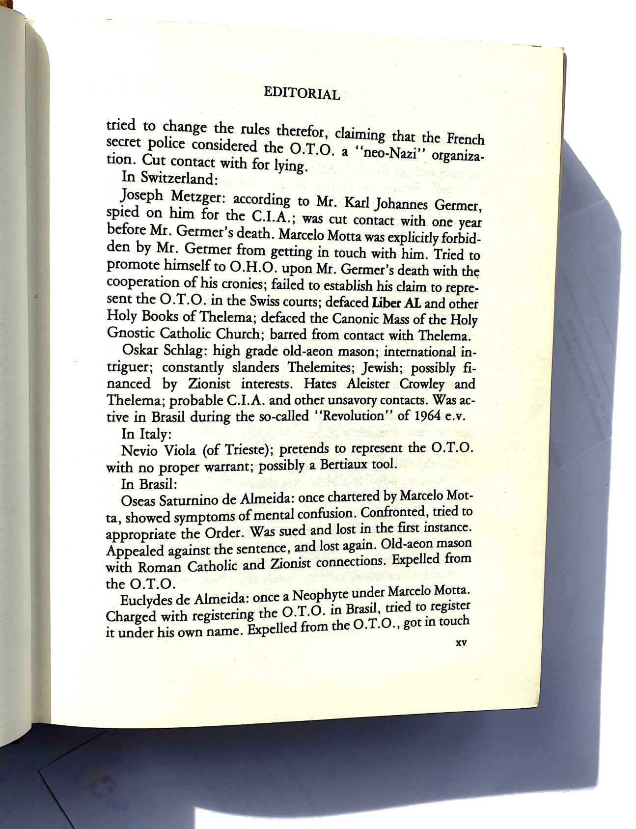 More about/from Oscar Schlag and Did you know Oscar Schlag? For further details on the background of Motta’s activities within the various versions of the O.T.O., as well as his involvement in legal disputes concerning the copyright of O.T.O. materials — particularly those related to the works of Aleister Crowley — see the Song of the Whitewash. Uma O.T.O. no Brasil. |